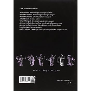 Avant-propos Explications de quelques signes et abreviations Bibliographie Premiere partie - Le latin vulgaire: notions generales A. Le latin vulgaire et latin tout court B. Le latin a la conquete du monde 1. L'expansion romaine 2. La romanisation 3. Elaboration du latin commun et litteraire C. Les " ages" du latin D. Sources du latin vulgaire E. De l'unite latine a la diversite romane Deuxieme partie - Les sons A. Les voyelles 1. Duree, timbre et accent 2. Voyelles simples 3.Diphtongues 4. Syncope 5. Hiatus 6. Prothese et apherese 7. Apocope B. Les consonnes 1. Les semi-voyelles w et y 2. L'aspiration h 3. Occlusives aspirees grecques 4. Les occlusives sourdes et sonores 5. Consonnes geminees et consonnes simples 6. Groupes de consonnes a) Assimilation b) Traitements particuliers de groupes intervocaliques c) Groupes de consonnes secondaires non toleres 7. Consonnes finales 8. Dissimilation consonantique Troisieme partie - Les mots A. Generalites B. Facteurs psychiques C. Facteurs sociaux D. Facteurs ethniques E. Onomatopees et mots expressifs F. Derivation 1. Derivation proprement dite ou suffixation a) Suffixes nominaux b) Suffixes verbaux 2. Derivation retrograde G. Composition H. Formation par prefixes I. Changement de sens Quatrieme partie - Les formes et leurs fonctions A. Generalites B. Le nom 1. Le genre 2. Les themes 3. Les declinaisons 4. Ruine et declinaison 5. L'accusatif et le nominatif 6. Formes casuelles figees 7. Le comparatif et le superlatif 8. Noms de nombres 9. Les pronoms C. Le verbe 1. Les voix - Transitivite et intransivite 2. Le passif 3. Les temps de l'actif 4. Le subjonctif 5. L'imperatif 6. Les themes de l'infectum 7. La conjugaison inchoative 8. Les formes personnelles de l'infectum 9. Les formes non personnelles de l'infectum 10. Les formes personnelles du perfectum 11. Les formes non personnelles du perfectum Cinquieme partie - La phrase A. La phrase simple 1. L'accord 2. L'interrogation 3. "Oui" et "non" dans les reponses 4. La negation 5. L'ordre des mots 6. Complements d'attribut et d'apposition 7. Complement d'adverbe B. La phrase complexe 1. Coordination et subordination 2. Termes de coordination 3. La proposition relative 4. Propositions completives et circonstancielles 5. L'interrogation indirecte 6. La phrase conditionnelle C. Constructions absolues Anthologie de textes latins teintes de vulgarismes Addenda et corrigenda Index.